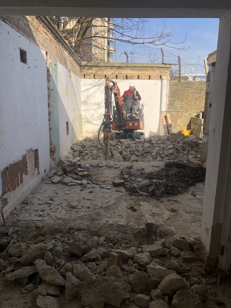Toilet Area Preparation: Images six and seven display workers breaking concrete to prepare for the new toilet installation.
